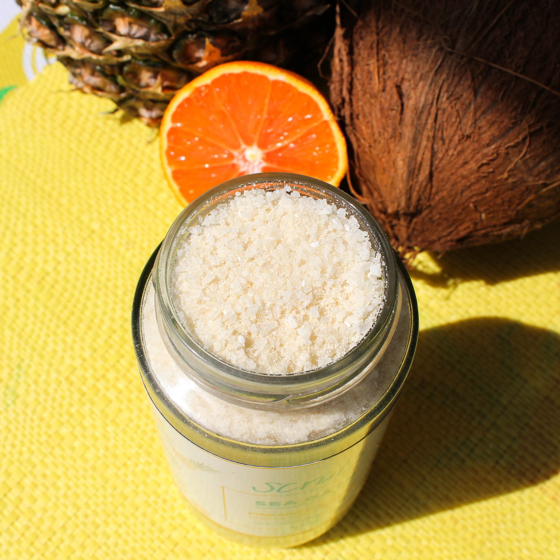 Pineapple Splash Sea Bath: Epsom salt, dead sea salt, coconut oil, coconut milk, pineapple powder, Kaolin clay, Sicilian blood orange essential oil.
