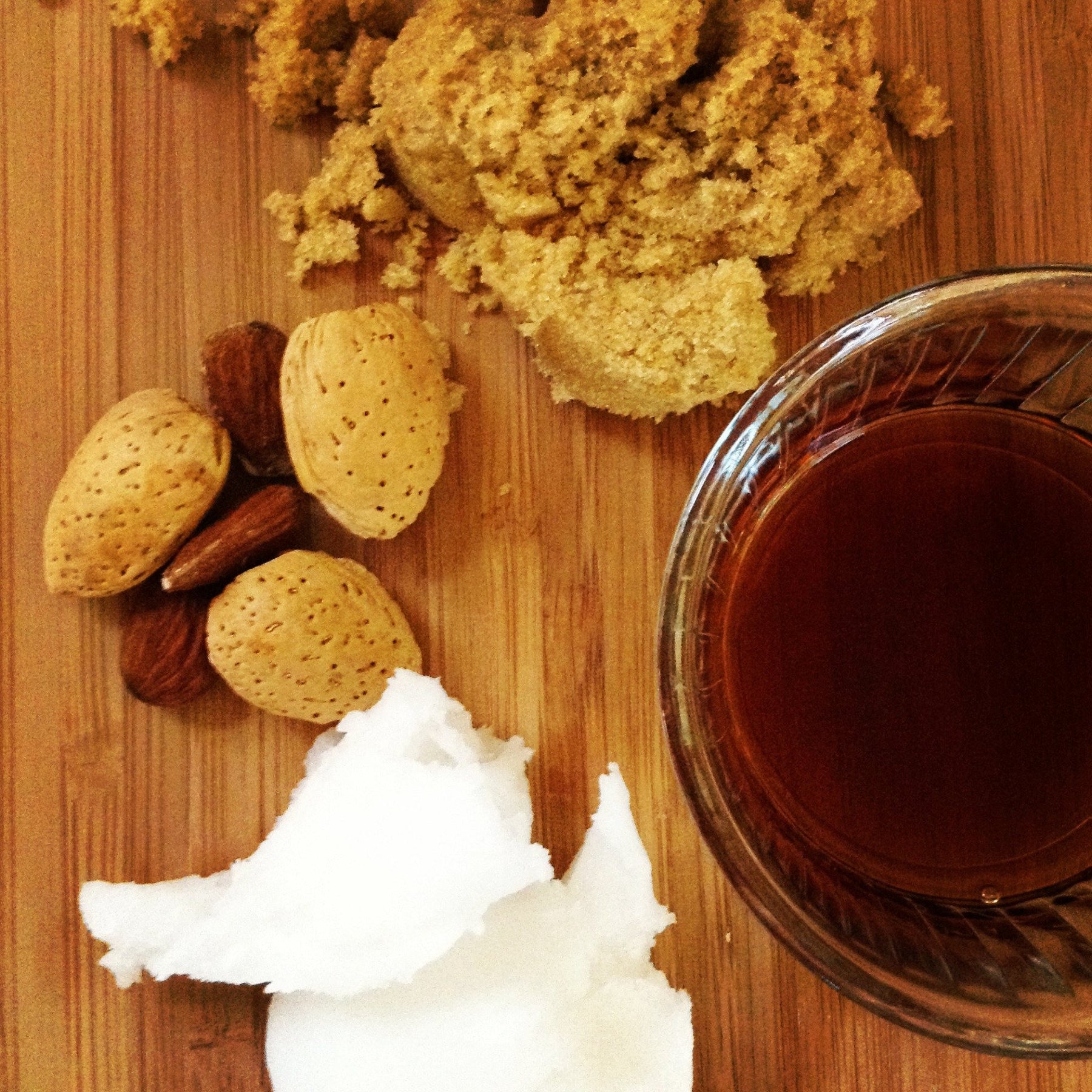 Brown sugar, organic coconut oil, pure almond extract, and pure vanilla extract.